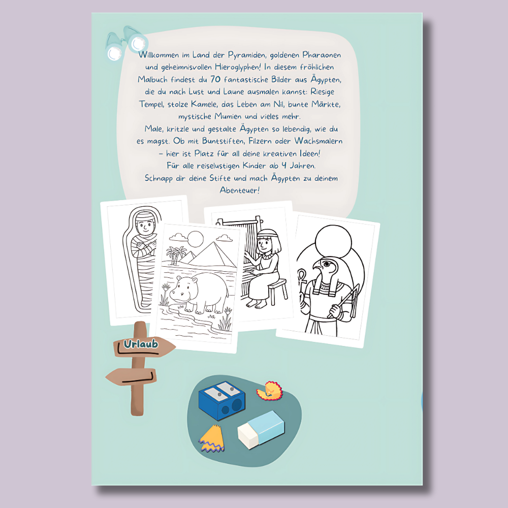 Abenteuer im Land der Pharaonen! Mit diesem liebevoll gestalteten Kinder Malbuch tauchen Mädchen und Jungen ab 4 Jahren in die faszinierende Welt Ägyptens ein – von den geheimnisvollen Pyramiden bis zu den beeindruckenden Tempeln. Ob zur Reisevorbereitung, als kreative Beschäftigung im Urlaub oder einfach für kleine Ägypten-Fans zu Hause: dieses Malbuch sorgt für spannende Unterhaltung und viel Fantasie.
